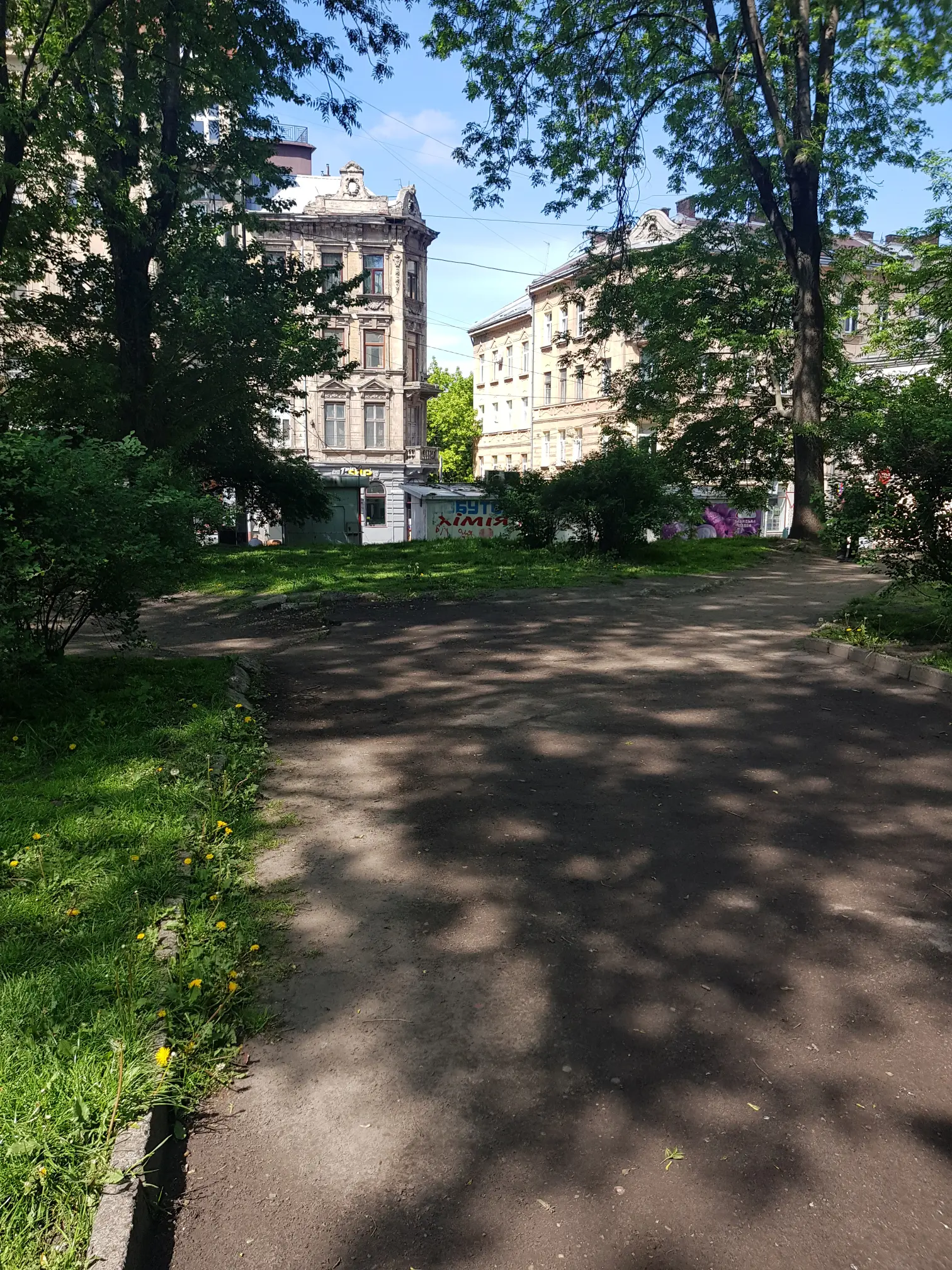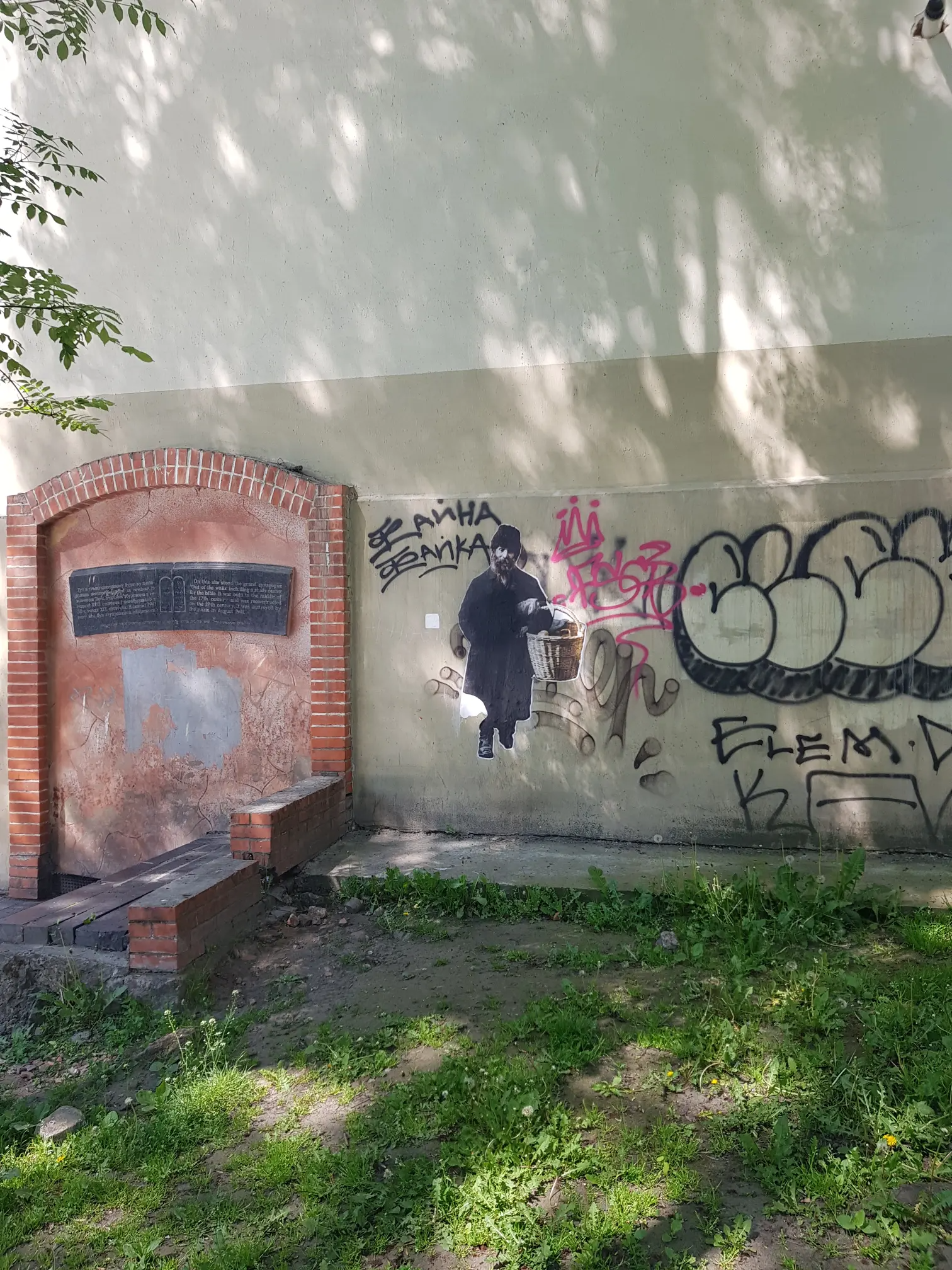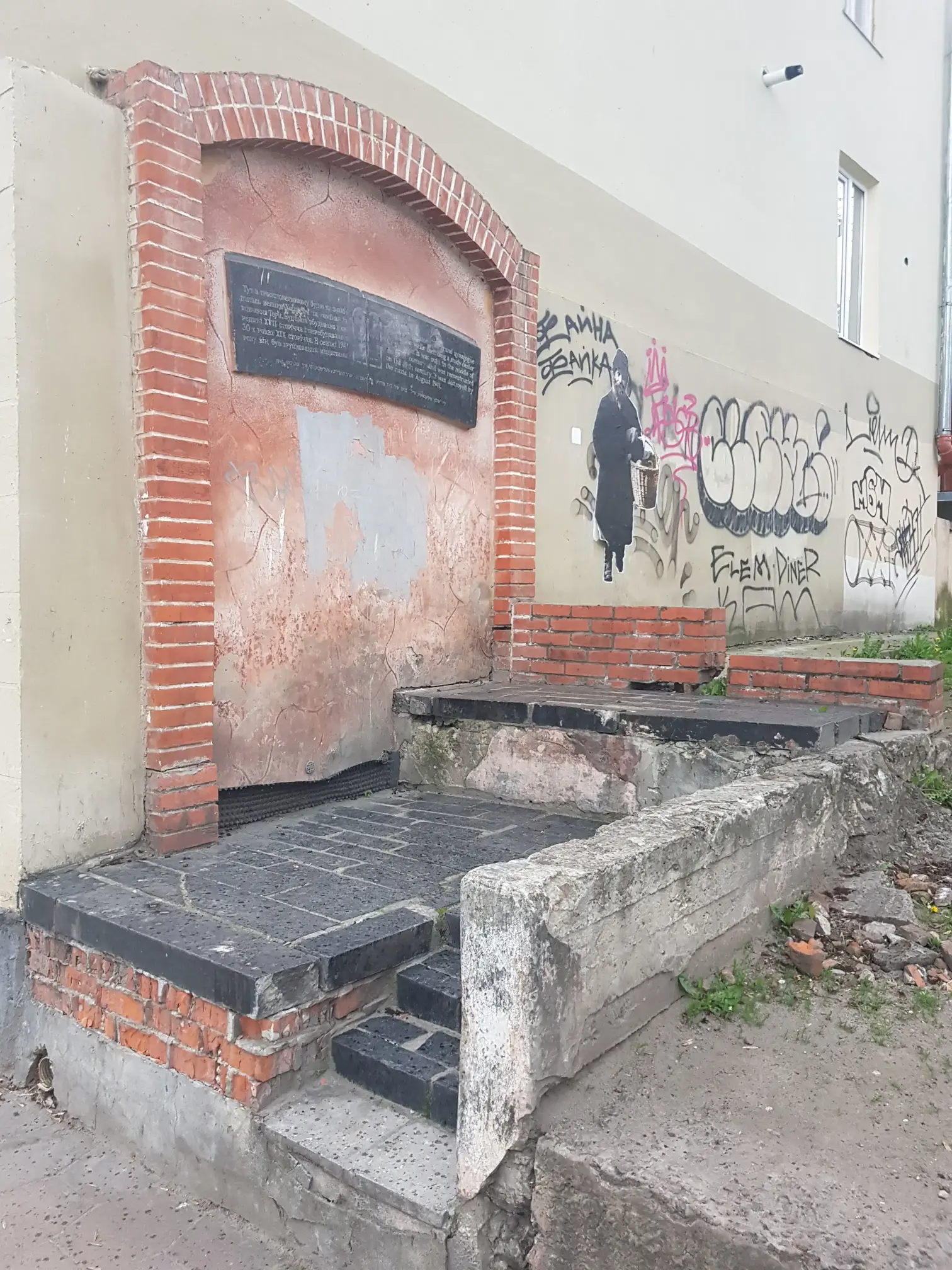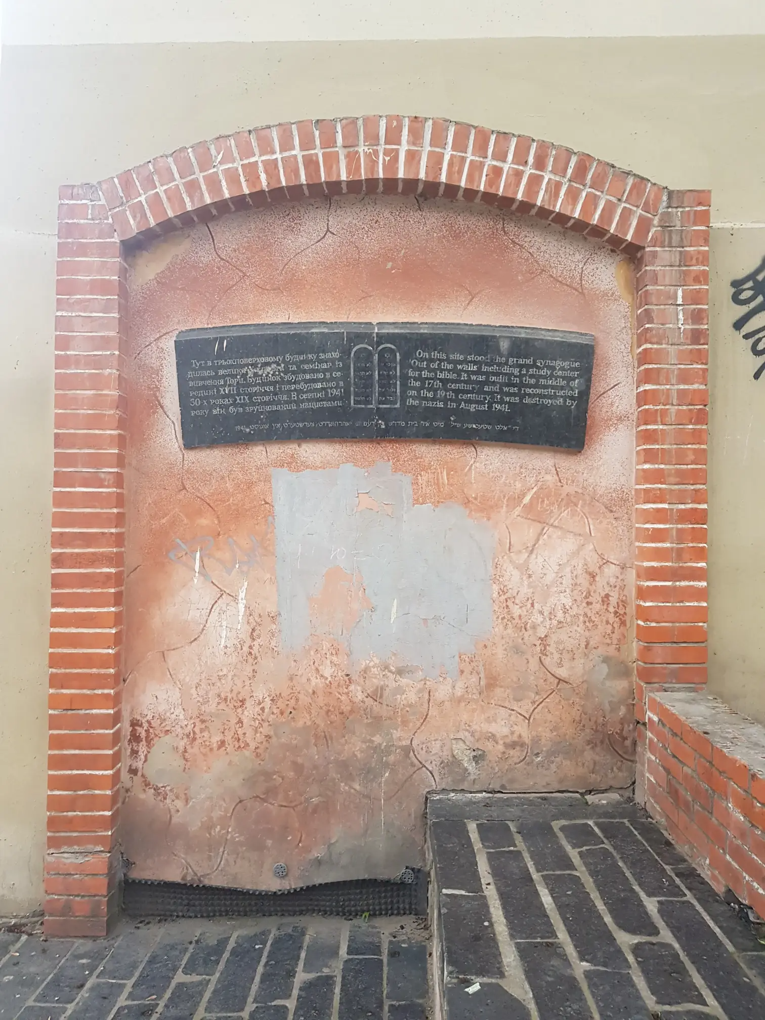 There are appropriate memorials at the sites of the Progressive Synagogue (Tempel) and Great Synagogue on either side of Bohdana Khmelnytskoho Street, but the former space has become a drinkers den while a children's playground has been built over the latter. Both synagogues were destroyed by Nazis.