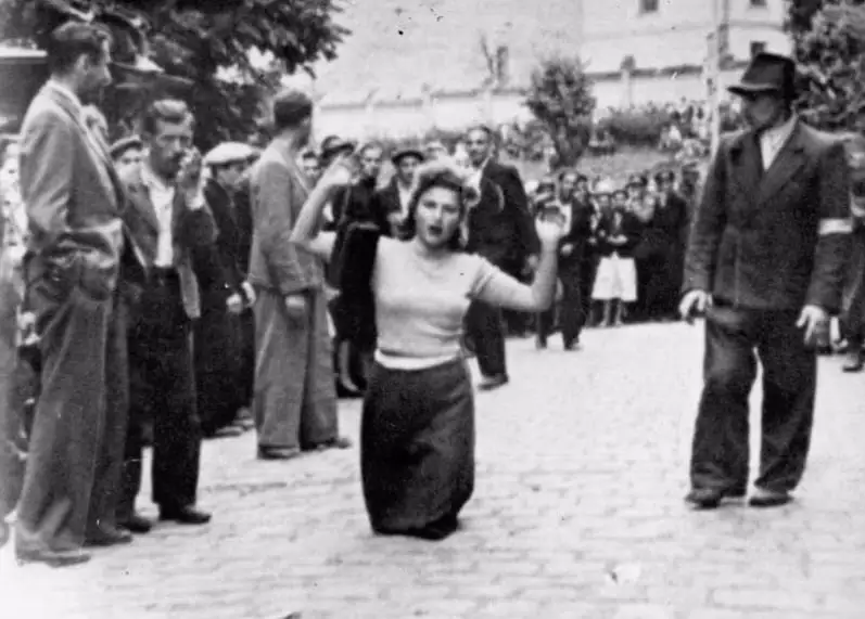US soldiers found 8mm footage in SS barracks (Augsberg, Germany) that shows terrified Jewish women being dragged out of their homes then beaten by Ukrainian men wielding iron bars.